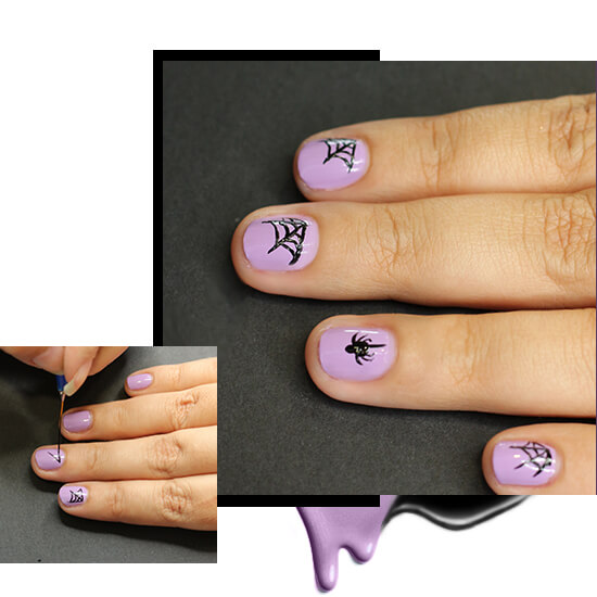 El detalle de este look está en la arañita colgante. Primero dibujamos una línea al centro de la uña hasta la mitad. Luego, con la ayuda de un punzón (si no tienen uno pueden usar un fósforo) hacemos dos puntitos, el cuerpo y la cabeza de la araña. Terminamos el dibujo agregando pequeñas patitas delgadas.