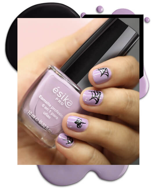 Dentro de los colores típicos de Halloween está el morado, pero esta vez usaremos su versión pastel con el esmalte Lila Femme. Aplicamos una capa delgada en todas las uñas, dejamos secar y aplicamos una más para tener un pintado uniforme.