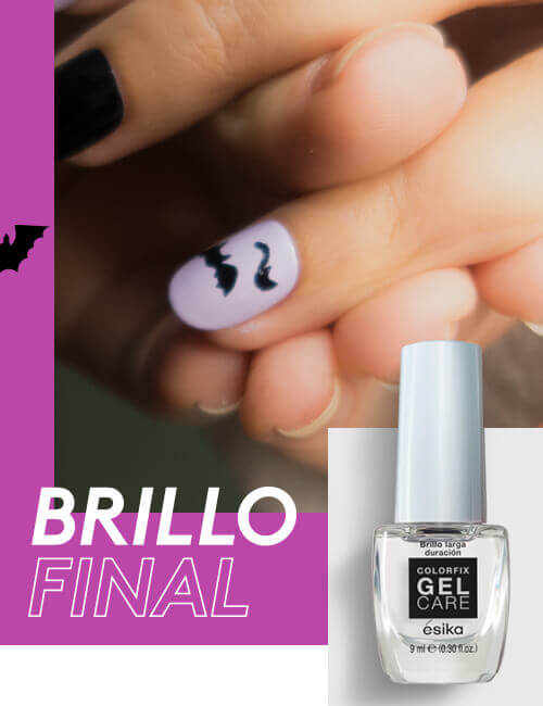 Para crear el cuerpo de los murciélagos nos ayudaremos de un pincel punta fina, con él dibujamos una media luna y unos cachos (uno a cada lado) con Colorfix Gel Care en tono negro intenso.