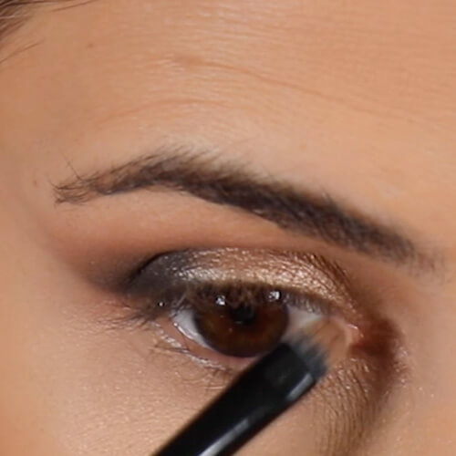 Para eso, utilizaremos el tono café de la paleta Midnight Rock y lo aplicaremos en la parte externa del ojo.