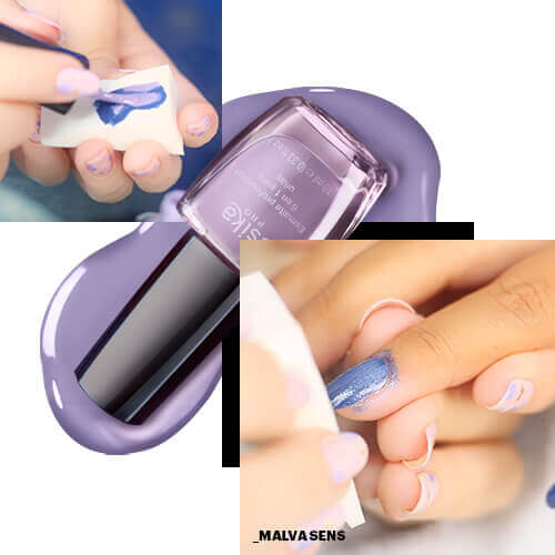 Luego, en una esponja pequeña de maquillaje, pon como base el tono Azul Mystic y un par de líneas del tono Malva Sens y procede a darle varios toques moteados a tu uña previamente pintada.