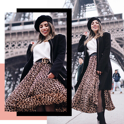 Otro look que llamó mucho la atención (y encantó) fue la falda animal print con la boina parísina, dándole un toque súper elegante. Katy Esquivel nos muestra que es posible combinar faldas o vestidos en invierno sin ningún problema (las leggins, nuestras mejores amigas).