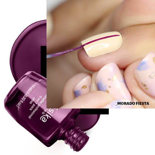 Con un pincel delgado, afina tu pulso y traza la primera línea con el tono Morado Fiesta.